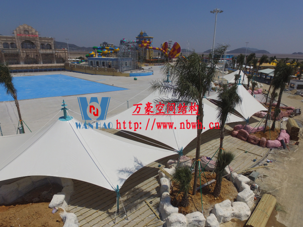 海闊天涳水世界位于浙江省象山縣大目灣新城,北與松蘭山國家“AAAA”級風(fēng)景旅游區(qū)相接,東臨大目洋,南連東陳鄉(xiāng),距象山縣城8公里,成為大目灣新城最先動建的重大膜結(jié)構(gòu)功能性項目,由寧波萬豪空間結(jié)構(gòu)工程有限公司承建。現(xiàn)場測量、深化設(shè)計、制作及安裝由寧波萬豪空間結(jié)構(gòu)工程有限公司全權(quán)負(fù)責(zé);用鋼量高達(dá)180噸,建筑面積達(dá)5000平米。