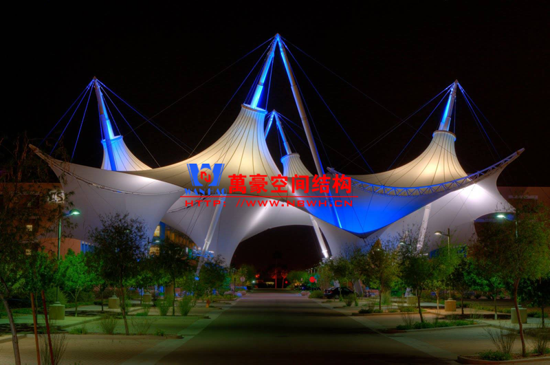 山東小品膜結構工程的膜材是氟塑材料表面涂層與織物布基按照特定的工藝粘合在一起的薄膜材料。常用的氟塑材料涂層有PTFE(聚四氟乙烯)、PVDF(聚偏氟乙烯)等??椢锊蓟饕镁埘ラL絲(滌綸PES)和玻璃纖維有兩種。膜材的粘合就是將涂層與基材合二為一組成通整體。膜結構建筑結構所用的膜材大多是以壓延成型和涂刮成型的。所謂壓延成型,就是將選定的軟PVDF經塑煉后投入壓延機,按照所需厚度、寬度壓延成膜,立即與布基粘合,再經過軋花、冷卻即可制得壓延膜材。而涂刮成型,則是將聚氯乙烯糊均勻地涂或刮在布基上,再加熱處理即可獲得涂刮膜材,普遍的是采用刮刀直接涂刮,也有采用輥式涂刮的。
