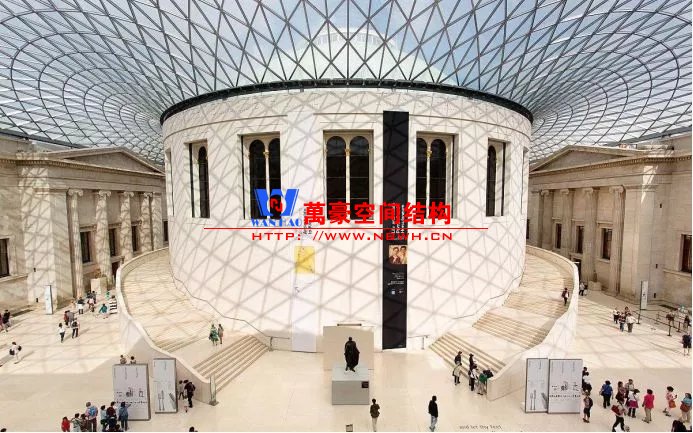 這個(gè)經(jīng)典的改造項(xiàng)目把輕與重巧妙組合。鋼結(jié)構(gòu)網(wǎng)殼內(nèi)側(cè)支承于圓形閱覽室,外側(cè)支承于方形博物館建筑的內(nèi)墻,通過(guò)找形分析得到一個(gè)拱起的規(guī)則形態(tài)。