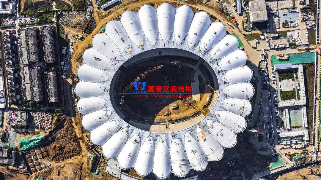 體育場(chǎng)罩棚整體造型呈馬鞍形,采用空間管桁架懸挑結(jié)構(gòu)體系,南北長(zhǎng)332m,東西寬316m,罩棚最高58.3m。2019年1月1日首吊,鋼結(jié)構(gòu)分包中建鋼構(gòu)歷時(shí)87天,消耗近5萬(wàn)工日、逾5千機(jī)械臺(tái)班,完成168單元、9500噸罩棚鋼桁架吊裝工作,于3月28日提前合攏。