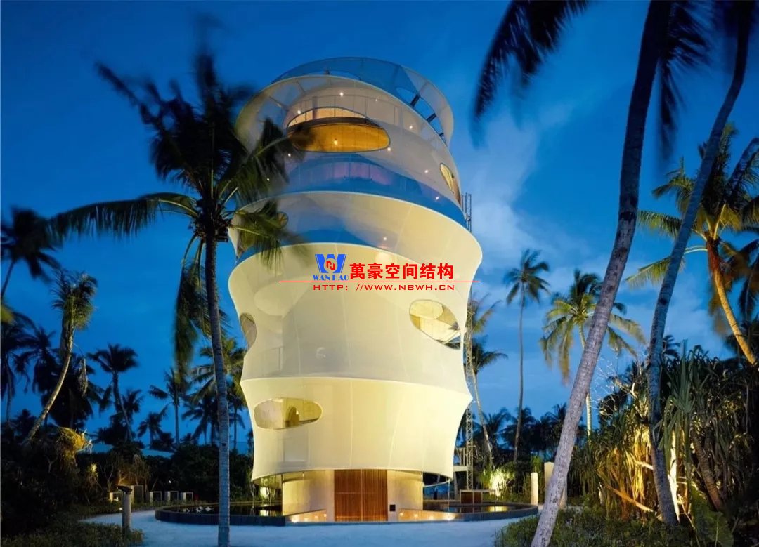 與島上其他傳統(tǒng)的“塔瓦魯”風(fēng)格建筑不同,由于其高度為23米,并且采用特殊結(jié)構(gòu),目前的結(jié)構(gòu)在島上占主導(dǎo)地位。建筑物的正面使用了鋼筋混凝土整體結(jié)構(gòu),而不是傳統(tǒng)的天然材料。它用作支撐管,由各個(gè)預(yù)制臺(tái)階制成的控制臺(tái)樓梯圍繞該支撐管旋轉(zhuǎn)。外圍的所有元素都被遮蓋在淺灰色半透明的法拉利381網(wǎng)孔膜中,遮陽(yáng)隔熱,又不影響視覺(jué)通透性。