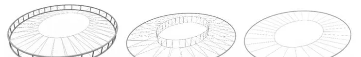 根據(jù)實際項目屋蓋造型、屋面覆蓋材質等的不同,環(huán)索屋蓋結構體系演變出了兩個壓環(huán)一個拉環(huán)、一個壓環(huán)兩個拉環(huán)、一個壓環(huán)一個拉環(huán)等不同的類型以滿足建筑需要。