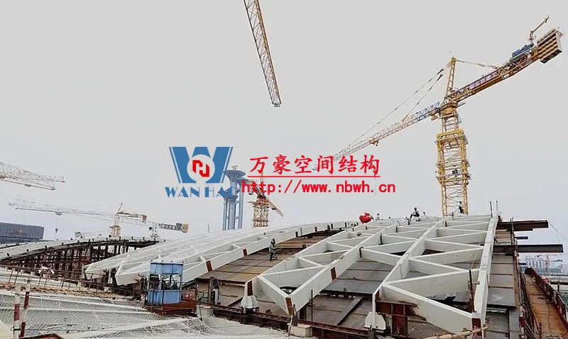 正在滑移施工的鋼屋面網(wǎng)殼用鋼量約2800噸,南北長168米,東西跨度72米,鋼屋蓋網(wǎng)殼面積大,距離地面高度為44米-52米,高空作業(yè)量大,構件吊次多達3000次,吊裝時間約2個月,工期緊,鋼結(jié)構焊接精度和質(zhì)量要求極高,屋蓋網(wǎng)殼為索承結(jié)構,控制變形難度大。