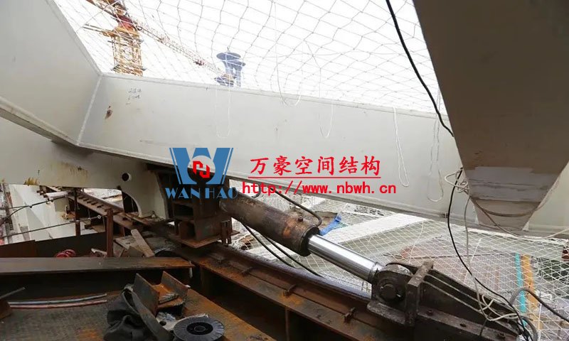 滑移前,事先設置滑軌,鋼橋兩端各安裝1臺-2臺液壓千斤頂和同步傳感器,從2個平臺分別向兩側(cè)頂推滑移,每滑移6米要進行鋼索張拉,確保屋面結(jié)構穩(wěn)固,最終將屋蓋滑移到設計位置。
