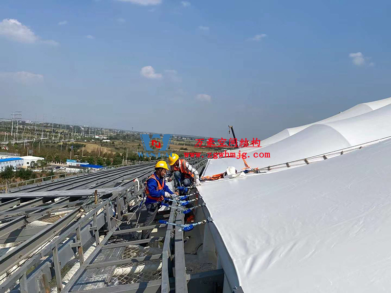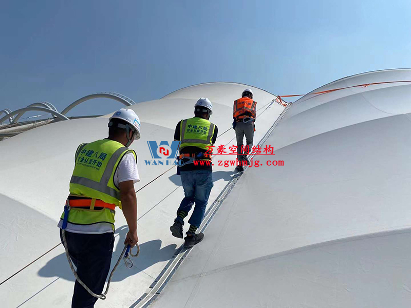 襄陽奧體中心PTFE膜結(jié)構(gòu)屋面歷經(jīng)幾個月的緊張工作,已經(jīng)全面投入高峰期作業(yè)。在最高溫的天氣夾雜著汗水和最熱情的狀態(tài)譜寫著萬豪空間結(jié)構(gòu)的故事,所謂藝高人膽大高瞻遠(yuǎn)矚,現(xiàn)場的每一個人通過自己最樸實(shí)的勞動方式贏得各方尊重。