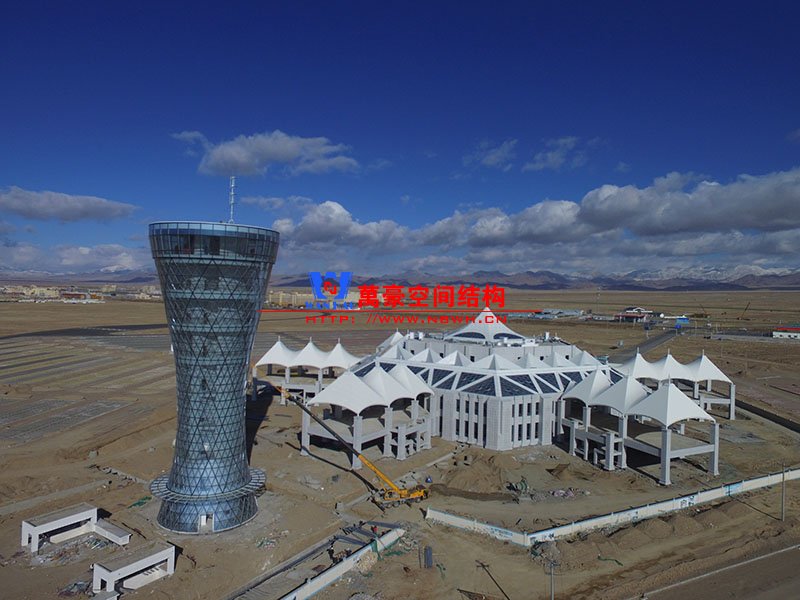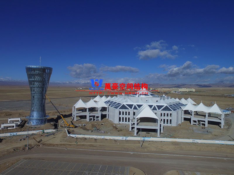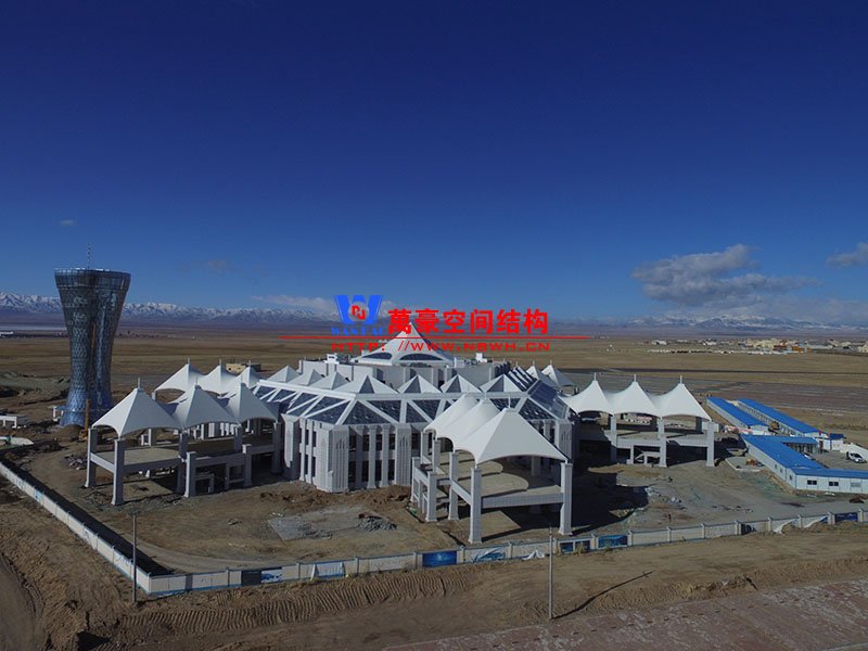 青海茶卡鹽湖天空之境集散中心鋼膜結(jié)構(gòu)項目位于擁有中國“天空之境”之稱的茶卡鹽湖。該項目分小蠻腰觀光塔和六角主樓兩部分,其中小蠻腰觀光塔由雙曲面空間鋼結(jié)構(gòu)相互交叉形成幾何形的外掛玻璃組成,主樓由雙曲面穹頂及6條連廊組成。鋼結(jié)構(gòu)跨度35米,鋼膜總面積28000平米,鋼結(jié)構(gòu)用鋼量1100噸。建筑內(nèi)部空間明亮通透,遠(yuǎn)觀猶如大漠孤煙中的鹽湖之晶,近觀仿佛置身于鹽湖中的浪漫滿屋。