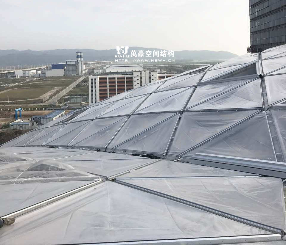 膜結(jié)構(gòu)工程位于廣東省珠海市橫琴新區(qū)。本工程一期用地面積22119㎡,總建筑面積63486.63㎡。建筑高度為36.5m,結(jié)構(gòu)形式為骨架式氣枕膜結(jié)構(gòu);上部為鋼結(jié)構(gòu)單層雙曲面鋼網(wǎng)殼+雙層ETFE氣枕膜覆蓋,氣枕總面積約23000平方米,共計750個ETFE氣枕,93個開啟式天窗,3000多根桿件組成,用鋼量2000多噸,單體構(gòu)件大結(jié)構(gòu)復(fù)雜。