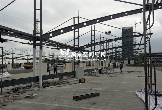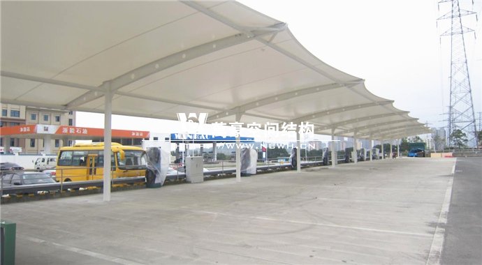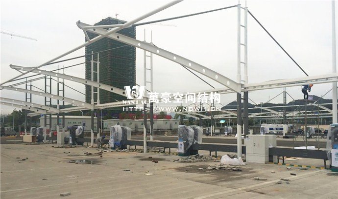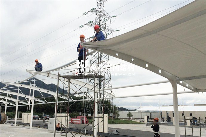 膜結(jié)構(gòu)雨棚施工面積約5138平方;用鋼量約80噸。施工難點(diǎn)在于工期緊。施工時(shí)天氣情況差,連續(xù)的陰雨天給鋼構(gòu)的油漆施工帶來了極大的麻煩并且延誤了工期。雨棚底下還要安裝充電樁,我們還要和充電樁施工班組進(jìn)行技術(shù)對接,規(guī)劃充電樁的安裝位置。由于工期緊,天氣狀況差,我們動用了兩個(gè)施工班組加班加點(diǎn),土建、鋼構(gòu)交叉施工,最后如期完工。由于每個(gè)雨棚長度比較長,施工班組在立好鋼構(gòu)件之后從中間開始往兩邊安裝膜布,使工作效率有了很大的提高。