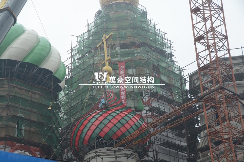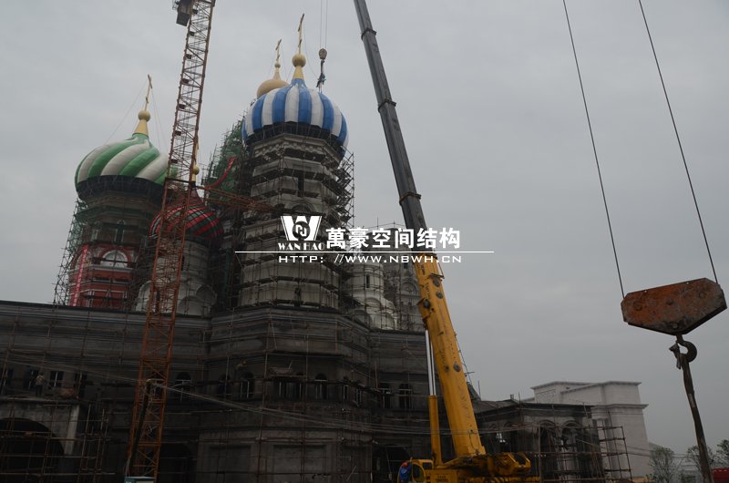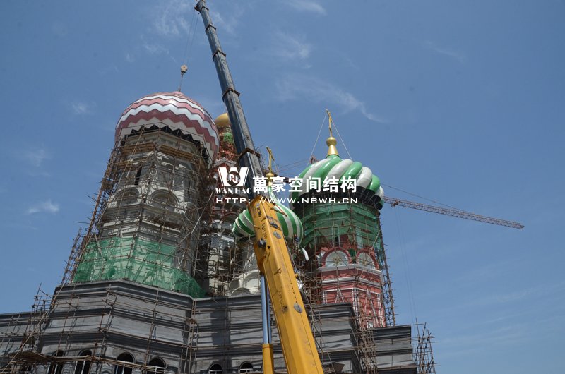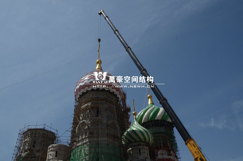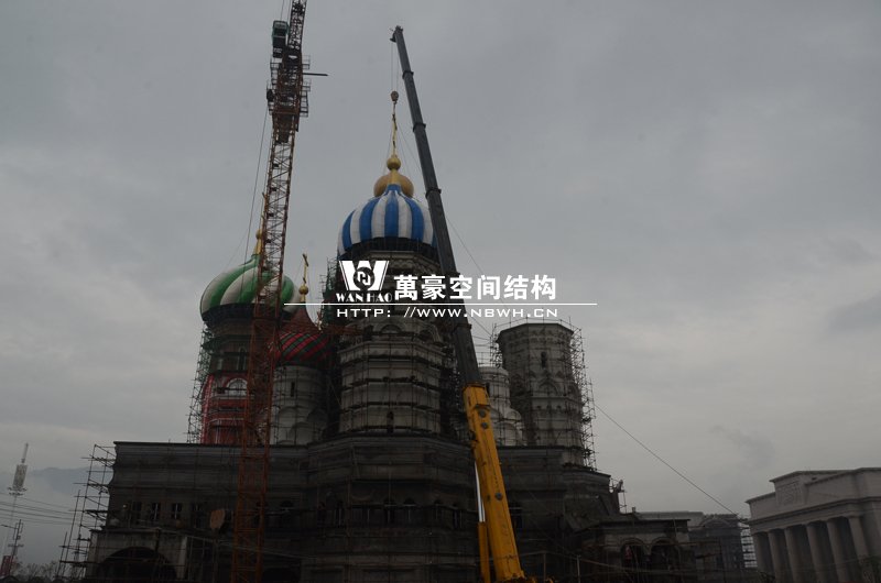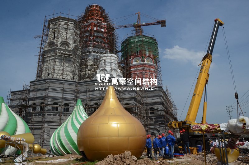 橫店影視城俄羅斯館屋頂鋼結(jié)構(gòu)裝飾球吊裝完成,本次吊裝的九個(gè)裝飾采用鋼結(jié)構(gòu)骨架、鋁合金外殼,最重的裝飾球達(dá)20來(lái)噸,采用300多噸的大吊車進(jìn)行吊裝。