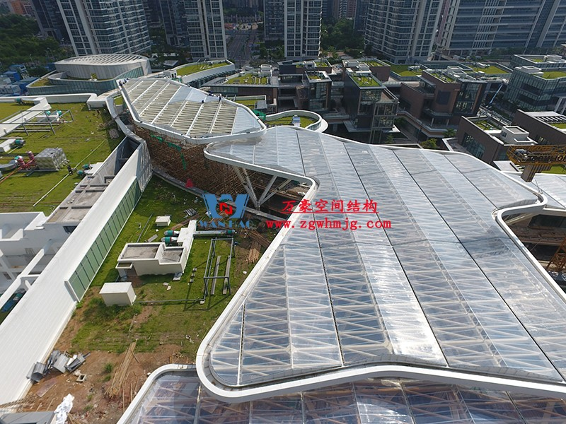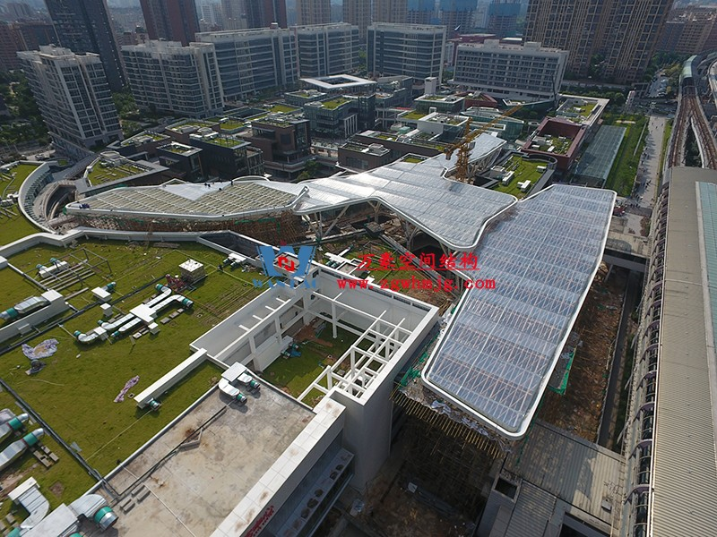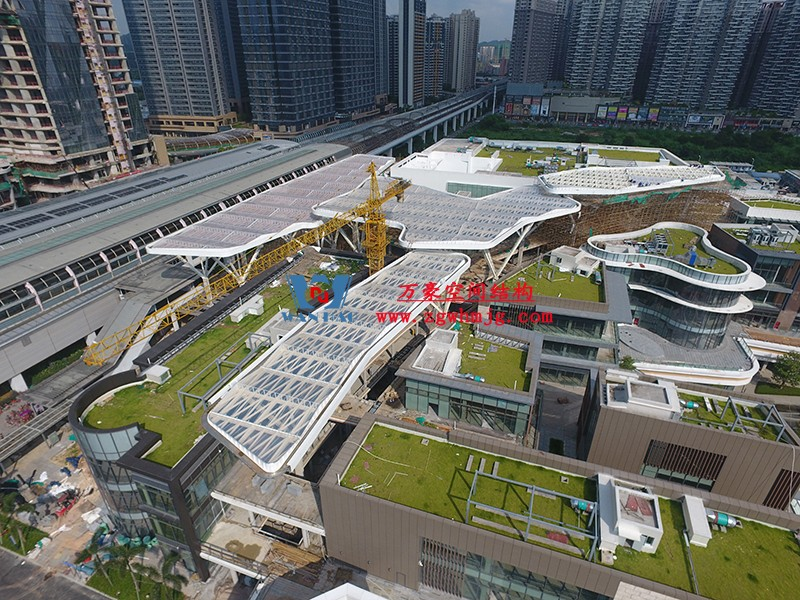 深圳龍華地鐵站ETFE天幕項(xiàng)目由我公司負(fù)責(zé)設(shè)計(jì)及承建,項(xiàng)目由4個(gè)出入口單體組成,ETFE展開面積9000平米,二次鋼結(jié)構(gòu)120噸,結(jié)構(gòu)落柱采用目前最流行的樹形節(jié)點(diǎn)支撐,在結(jié)構(gòu)安全的同時(shí)更具層次感。同時(shí)該項(xiàng)目也完美突出了ETFE膜材高透光、高自潔性及耐高溫的優(yōu)點(diǎn)。
