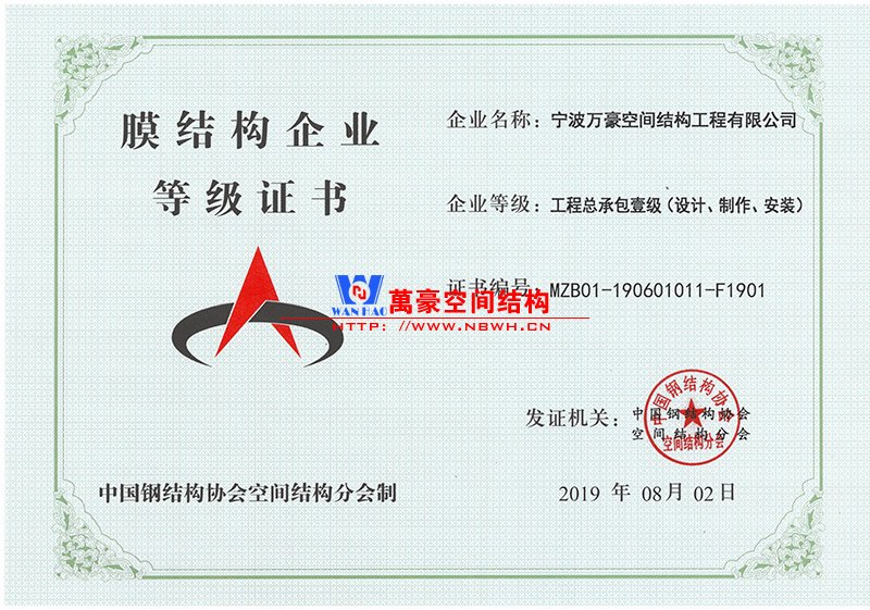 • 膜結構工程總承包特級(設計、制作、安裝)資質,鋼結構工程二級資質