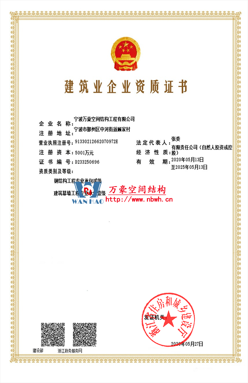 • 膜結(jié)構(gòu)工程總承包特級(設(shè)計、制作、安裝)資質(zhì),鋼結(jié)構(gòu)工程二級資質(zhì)