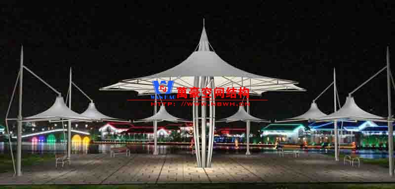 膜結(jié)構(gòu)遮陽棚工程頂棚面重量僅為常規(guī)遮陽棚的1/30,這就降低了基礎(chǔ)的造價。同時膜結(jié)構(gòu)工程奇特的造型和夜景效果有明顯的“建筑可識性”和商業(yè)效應(yīng),其價格效益比更高。