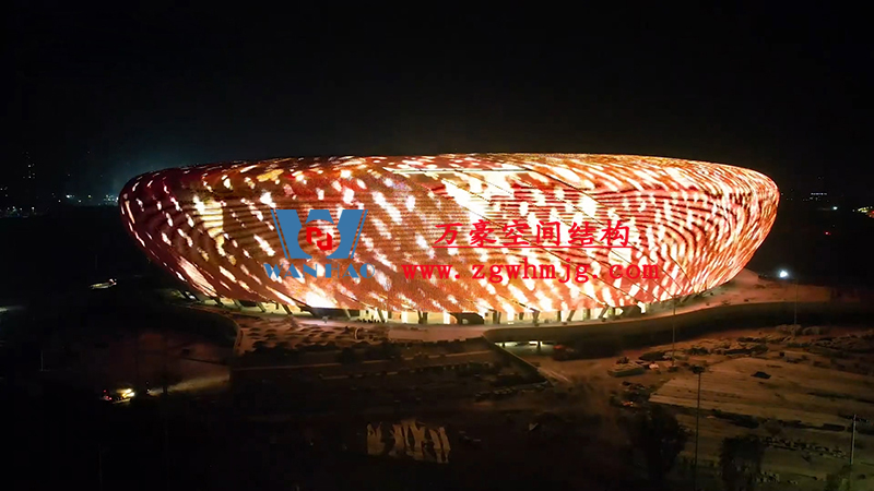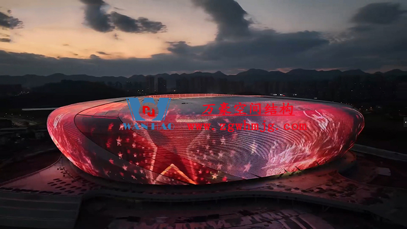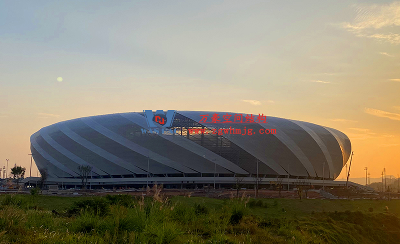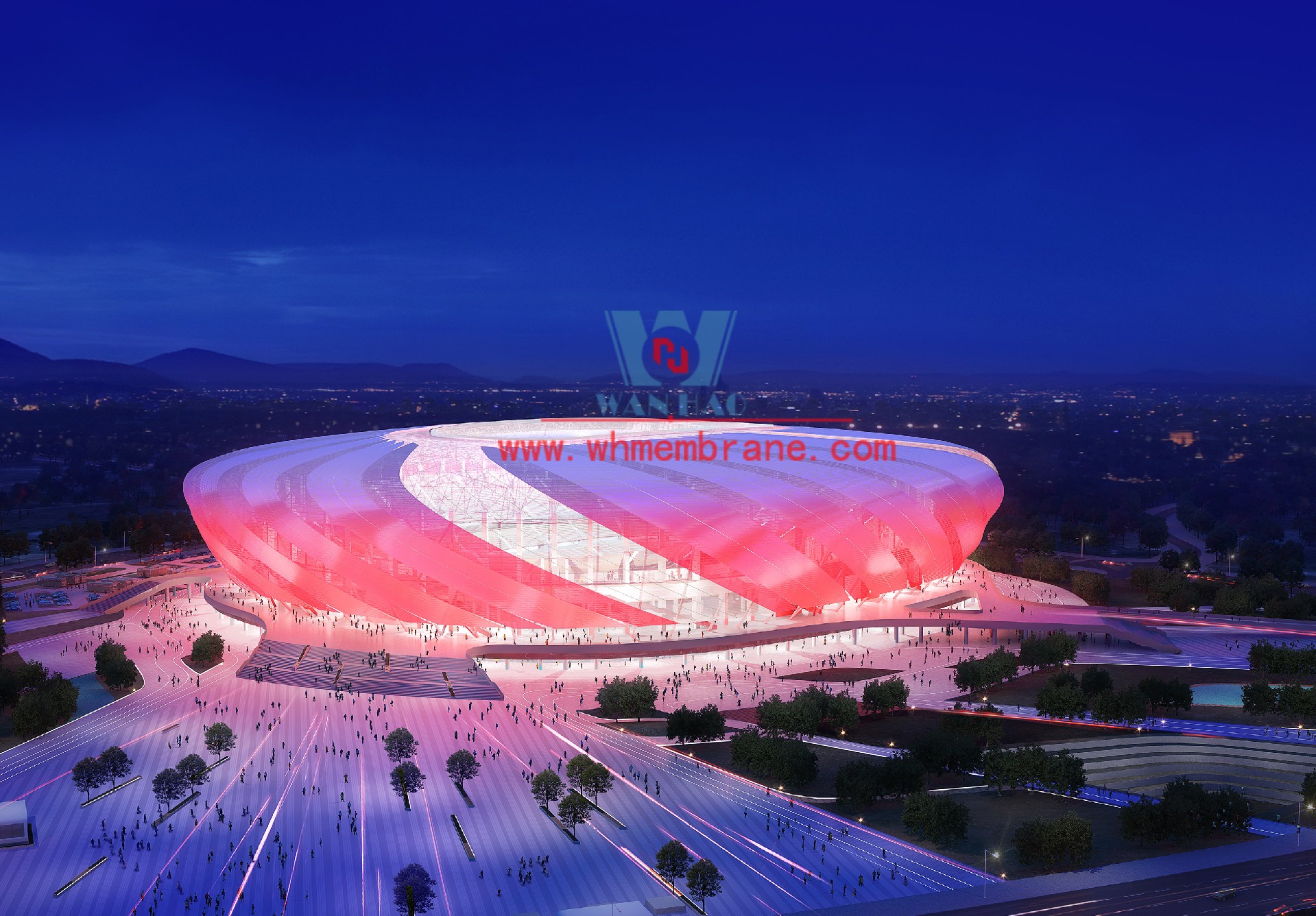 重慶龍興足球場項目位于重慶市兩江新區(qū),占地面積約303畝,總建筑面積約17萬平方米。足球場鋼屋蓋平面呈橢圓形,南北投影長283米、東西寬252米,屋面最大高度59.5米。該項目部分屋面材料選用進口高自潔ETFE膜材, 膜結(jié)構(gòu)展開面積合計30000平米。
