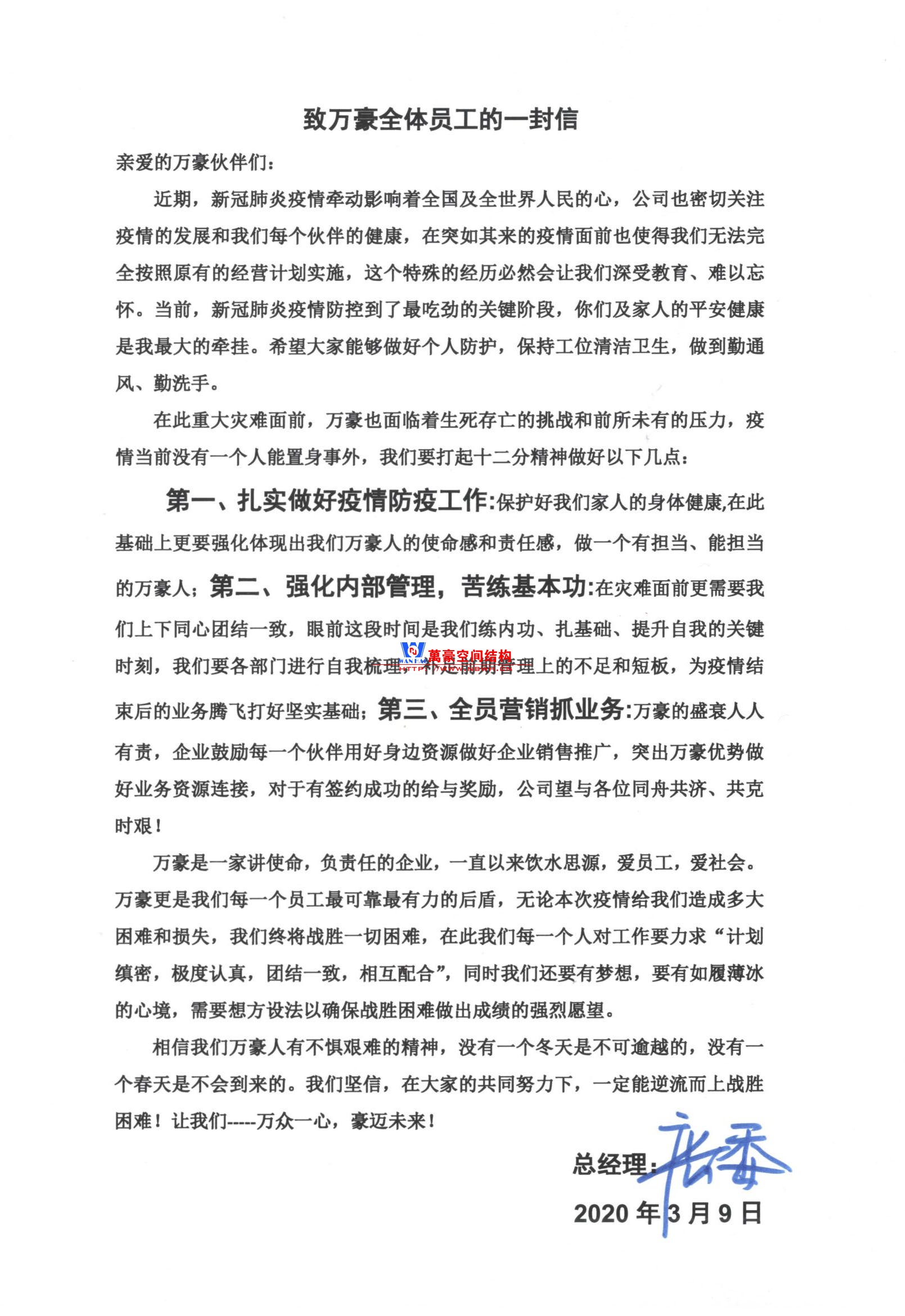 疫情當(dāng)前感謝大家返崗復(fù)工,在此疫情中我們深刻體會到了前所未有的壓力和困難,目前各行各業(yè)面臨著破產(chǎn)關(guān)門的風(fēng)險(xiǎn),我們同樣面臨著各方面的挑戰(zhàn)。在此存亡之際挑戰(zhàn)面前更需要我們上下同心,團(tuán)結(jié)一致共同面對目前的困難;萬豪是有使命感和責(zé)任感的企業(yè),在此危難時(shí)刻更能體現(xiàn)我們每個(gè)人的擔(dān)當(dāng)和格局,特此給萬豪全體員工書信一封,望大家能仔細(xì)查閱并落到實(shí)處,公司倡導(dǎo)全員營銷,非市場部門員工如相互有業(yè)務(wù)連接、推薦、介紹給公司,統(tǒng)一報(bào)備總經(jīng)辦蔡總處登記備案,簽約成功公司將給與獎勵。