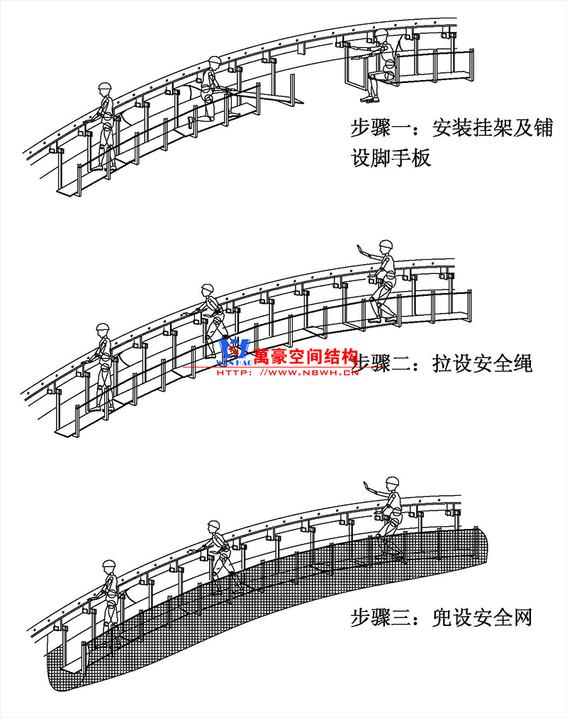 ⑷ 護(hù)欄及防晃纖繩安裝:用插接方式加高掛架外側(cè)立管并在立管上用大繩綁固兩道護(hù)身安全繩;每隔五個(gè)掛架拉一對(duì)防晃纖繩與二次部材筋板拉結(jié)。