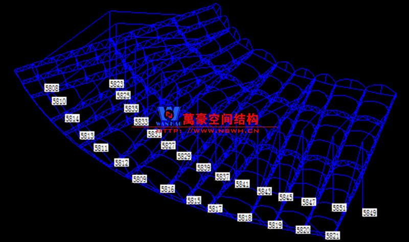 該工程膜結(jié)構(gòu)及相應(yīng)的支承結(jié)構(gòu),均是以內(nèi)部主體結(jié)構(gòu)為承載體,通過(guò)膜體及相關(guān)的結(jié)構(gòu)支承。選用3S3D11.0設(shè)計(jì)軟件進(jìn)行分析,計(jì)算簡(jiǎn)圖見圖II-19-8??紤]恒荷載0.01KN/ m2,風(fēng)荷載0.55KN/m2 ,雪荷載0.35KN/m2 ,活荷載0.3KN/m2。
