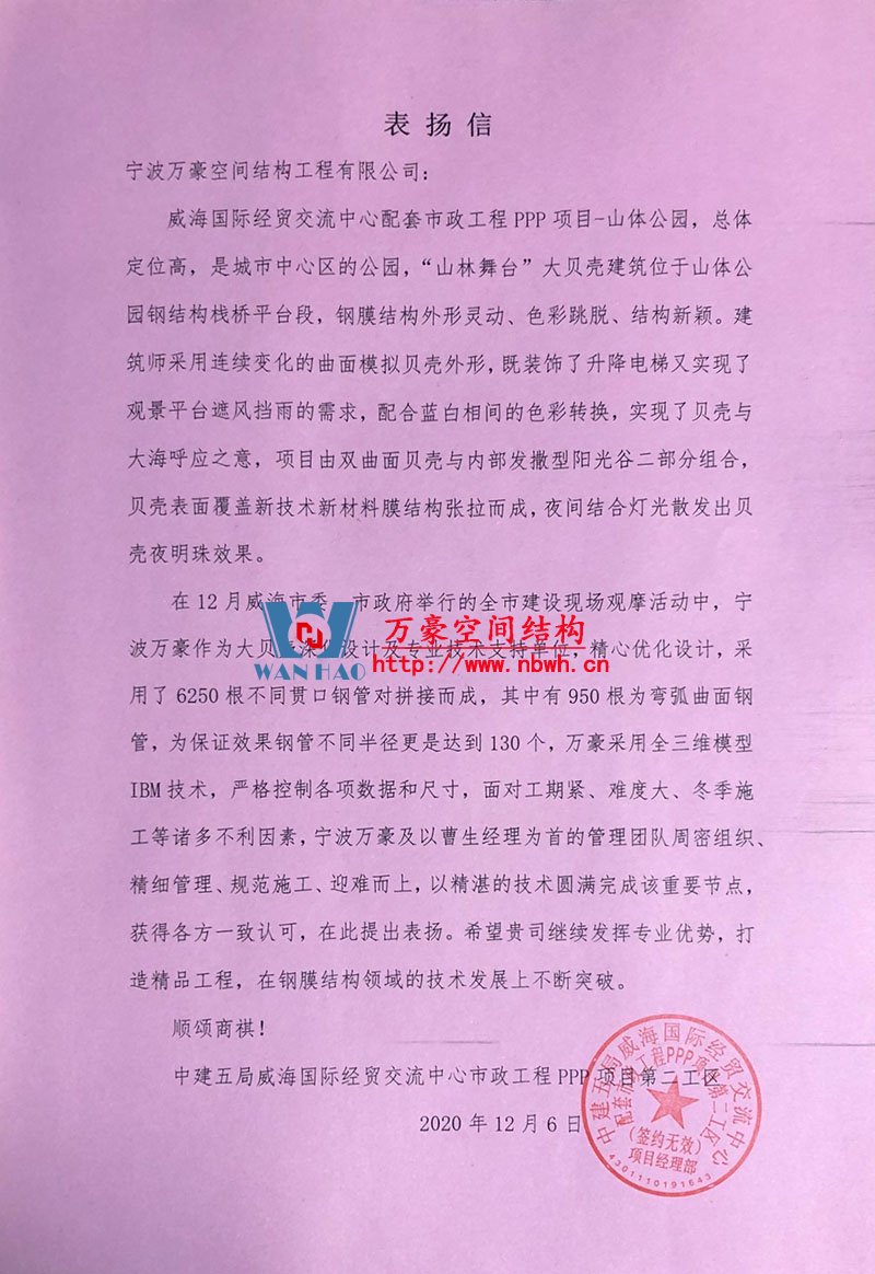 面對工期緊,難度大,冬季施工等不利因素,寧波萬豪空間結構管理團隊周密組織、精細管理、規(guī)范施工、迎難而上,以精湛的技術圓滿完成該施工部署。在12月威海市委、市政府舉行的全市建設現(xiàn)場觀摩活動中,獲得各方一致認可。