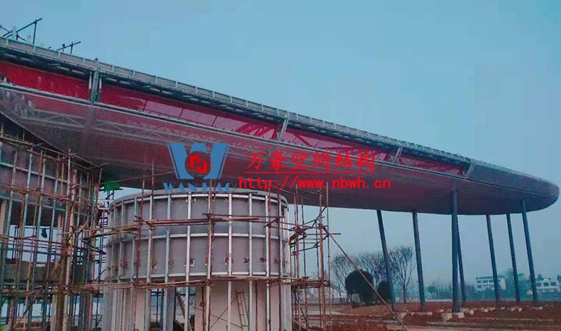 厚實的曲面屋蓋猶如航船底部沉重而又穩(wěn)定前行,船體的側身內(nèi)部選用了紅色的網(wǎng)格織物膜、外表皮選用了銀色網(wǎng)格織物膜猶如船體本身的防腐耐用與裝甲安全真實效果。主體頂部屋面選用ETFE材料通透明亮,結合LED燈光在夜幕中可以發(fā)散夜明珠般的光亮。四周肩部選用了銀色防水膜猶如船身防護層厚實穩(wěn)重,中間保衛(wèi)室的設計猶如船身部位船艙敞亮實用。