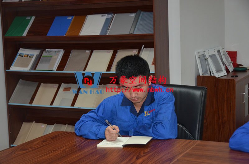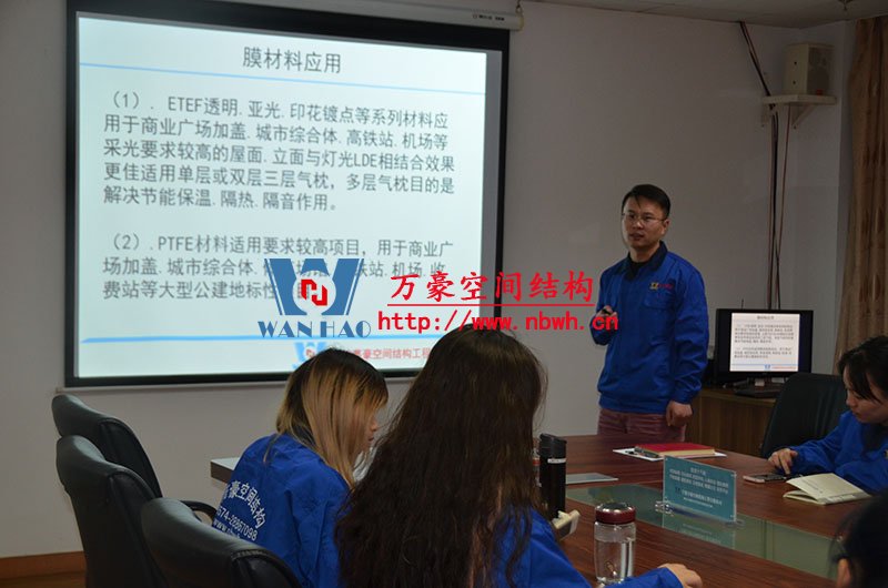 然后,我們的銷售主管教員工們學習了膜材料分類、膜結(jié)構(gòu)優(yōu)勢及應(yīng)用領(lǐng)域、膜結(jié)構(gòu)產(chǎn)品結(jié)構(gòu)形式等。