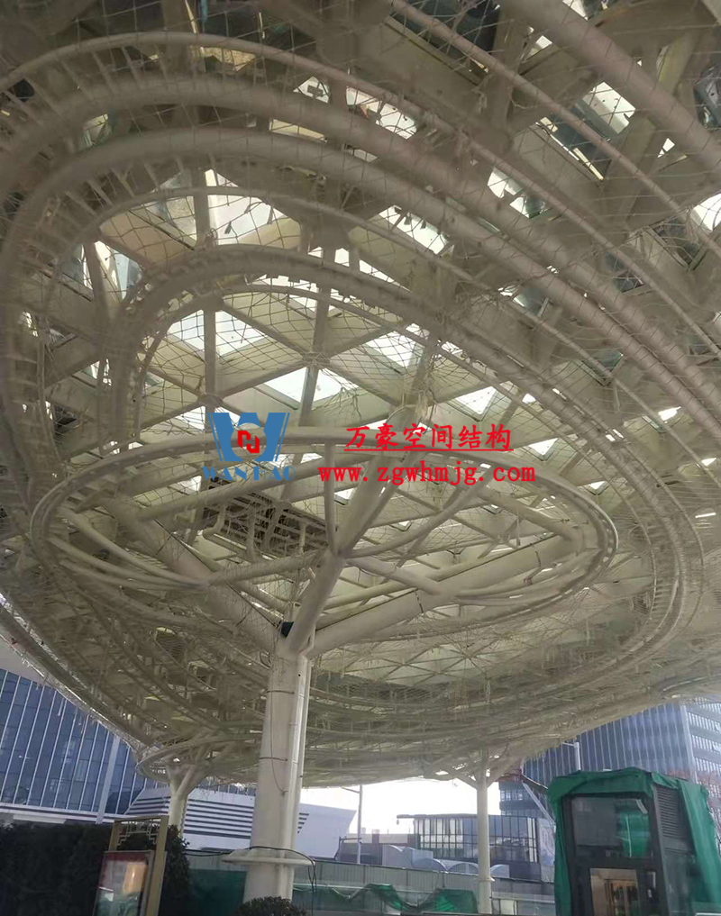 本工程鋼結(jié)構(gòu)為單層雙曲網(wǎng)殼結(jié)構(gòu)體系,平面上為對稱結(jié)構(gòu),大翅膀長跨約 50m,短跨約 25m,小翅膀長跨約 35m,短跨方向約 15m。建筑頂面為雙曲造型,建筑物最高點(diǎn)標(biāo)高約17米。總用鋼量800噸,膜體總面積約7000平方米。