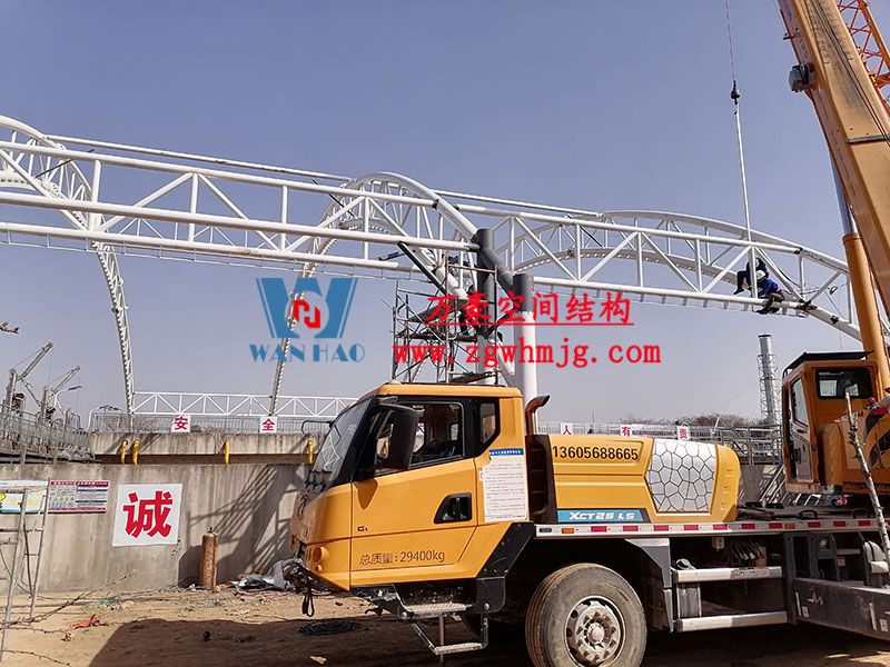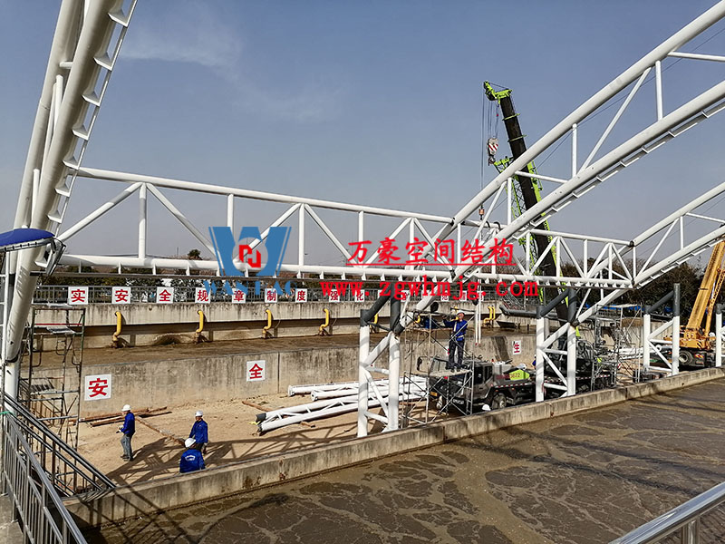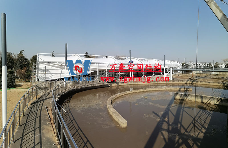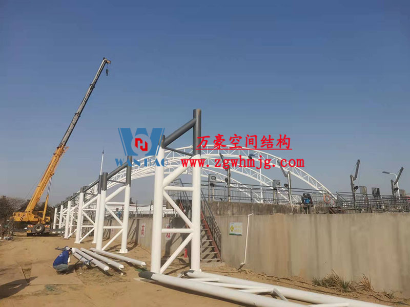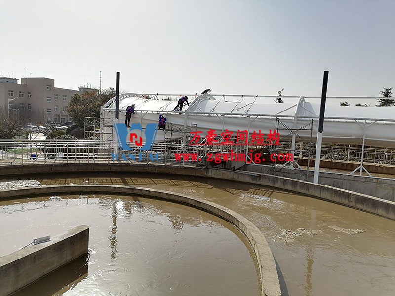 目前,進水口、粗格柵、細(xì)格柵、厭氧池兩個池子鋼結(jié)構(gòu)都已完成 ,厭氧池立面膜已張拉,開始裝側(cè)面膜,南區(qū)氧化溝三個主桁架完成 ,準(zhǔn)備進行下一步施工。