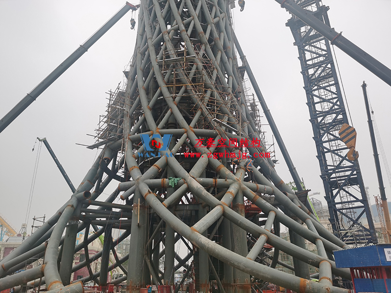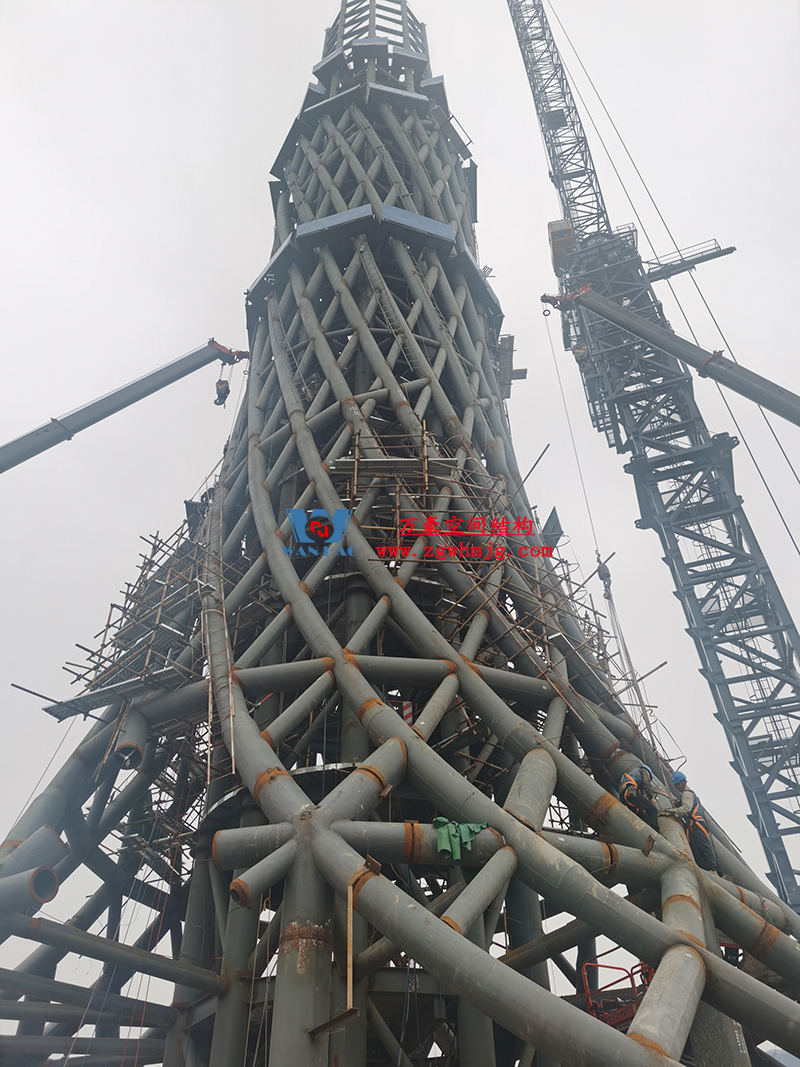 塔身為筒中筒鋼結構,內筒為等間距布置的10根豎柱和水平梁組成,外筒為雙向螺旋交織的菱形網(wǎng)格曲線空間鋼結構,形似廣州小蠻腰,呈現(xiàn)“纖纖細腰,不盈一握”的驚人審美效果,也與中國傳統(tǒng)審美觀相契合。