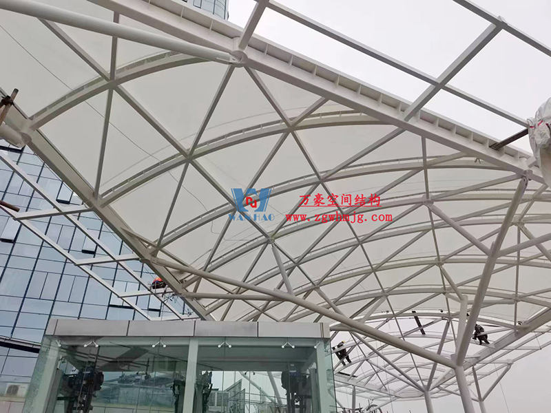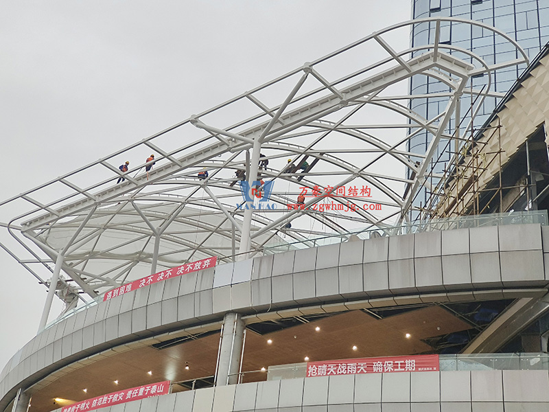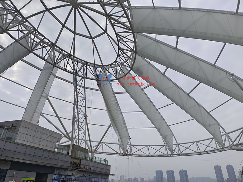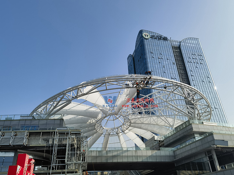 南充萬達(dá)項(xiàng)目鋼膜結(jié)構(gòu)ETFE蓋頂天幕工程,該項(xiàng)目總用鋼量500噸,其中主體鋼結(jié)構(gòu)400噸,二次鋼結(jié)構(gòu)100噸,膜材展開面積總計(jì)13500平米,其中ETFE膜(俗稱“軟玻璃”)7000平米,二氧化鈦高自潔涂層PVDF膜6500平米。本項(xiàng)目作為四川省南充市萬達(dá)廣場(chǎng)新地標(biāo)商業(yè)綜合體配套設(shè)施,建成后將成為南充市又一經(jīng)典之作。