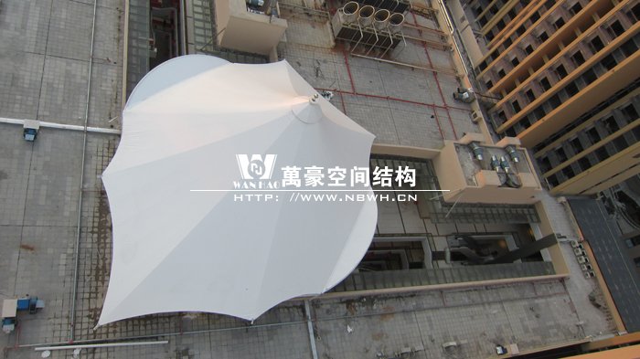 由于四周都是五層樓商鋪,本膜結(jié)構(gòu)項目是在商鋪中央的觀光電梯上面加蓋,膜面積約900m²,中間只有一根獨立立柱,地面高度為33.67米,立柱為Φ315*14,長為12.75米。四周有九根支柱Φ273*8,長度2、5、8米不等,和立柱連接為單管219*6,長度有18米和6米等不等長度。
