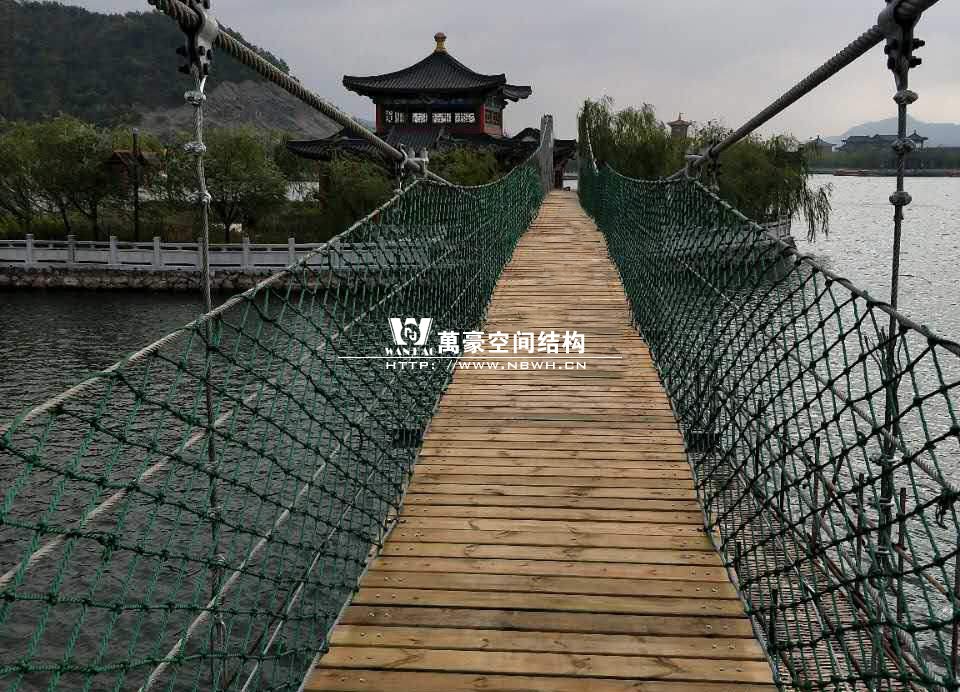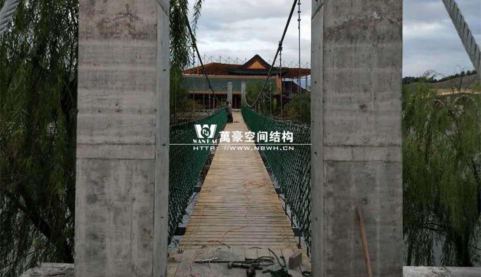 該橋采用8根柔性鋼絲繩,4支立柱作為受力構(gòu)件,橋面采用組合型鋼作為支撐面,上鋪防腐木枋板。根據(jù)橋面與水位的相對高程,吊橋主跨為65m。該橋橋面凈寬度為1.5m,吊橋橋面總寬度2.0m。上鋪4公分厚的防腐木枋板。最多可承受130人行走,橋下能自由通行龍船。符合景區(qū)游客娛樂性游玩與功能性通行的完美結(jié)合在一起。